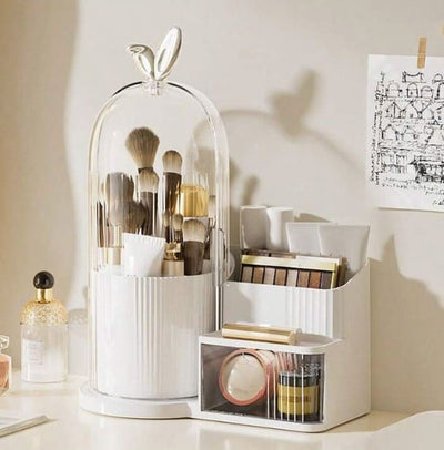 Upgrade your vanity with our Luxury Dome Makeup Organizer, a chic and space-saving solution designed to keep your beauty essentials organised in style. Featuring a transparent dustproof dome with a signature bunny-ear handle and a multi-compartment side unit, this aesthetic makeup storage box adds instant elegance to any dressing table.